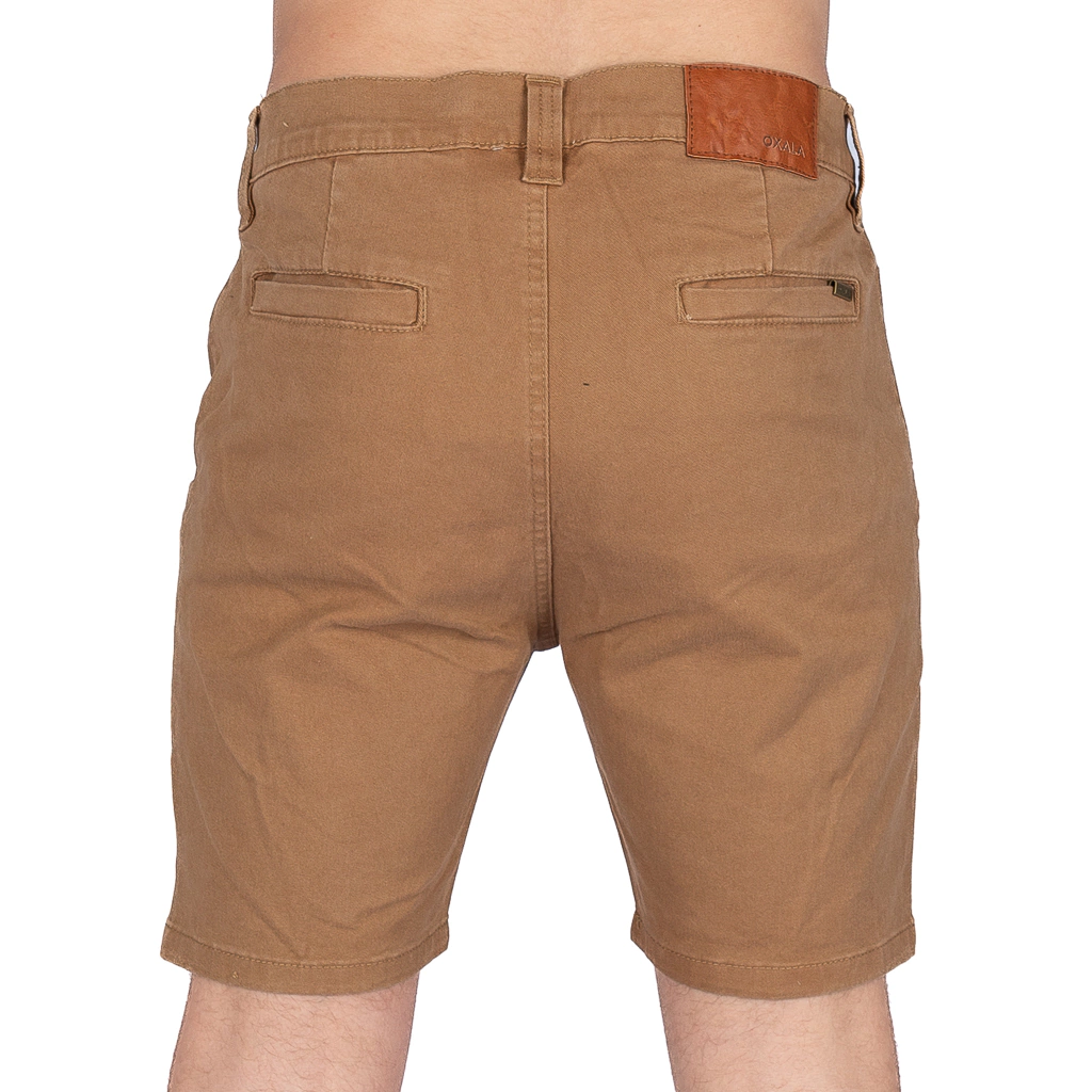 Bermuda corte chino confeccionada en gabardina elastizada , molderia slim tela construida Sarga 3x1, a base de algodón 98 % y 2 % elastano. Exclusivo diseño con dos bolsillos laterales y dos traseros estilo chino. Prenda procesada en lavadero (stone wash ). Atraques de seguridad en costuras críticas. Decorado con multietiquetas bordadas, boton hueco personalizado y detalle metalico personalizado en tapa bolsillo trasero.