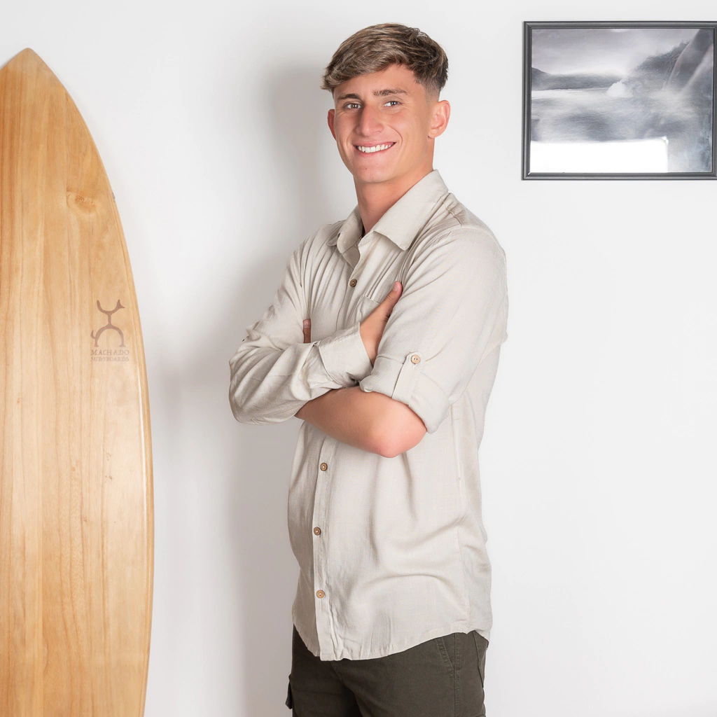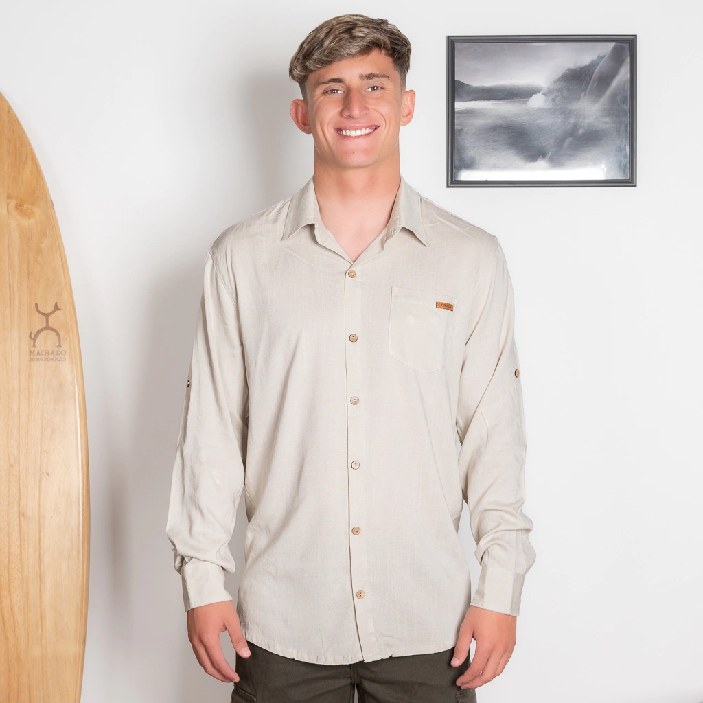 Camisa Lino Oxala: Confeccionada en lino ligero, esta camisa es la elección ideal para esos días cálidos. Cuenta con botones de coco y un bolsillo delantero plaque, lo que le otorga un toque distintivo. Su diseño de manga larga ajustable a 3/4 la convierte en una prenda versátil y cómoda.