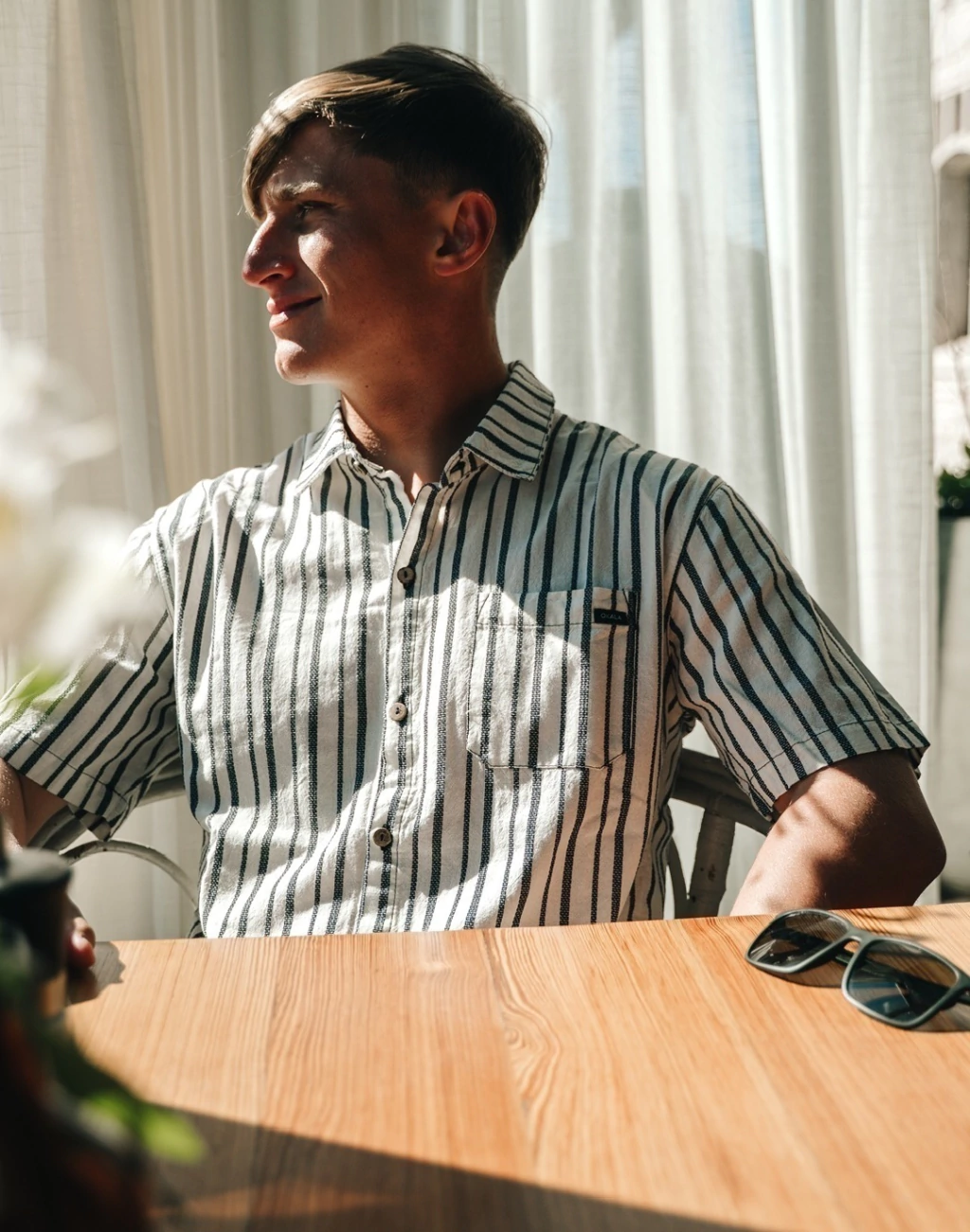 Camisa de lino rayada, liviana y fresca. Manga corta, bolsillo delantero y botones de coco que aportan un detalle natural.