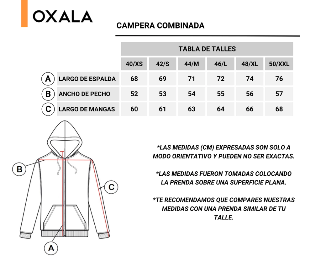Campera Oxala confeccionada con frisa invisibe 180grs, con tratamiento gamuzado brindando suavidad y confort en el uso, costuras reforzadas que nos permite contar con la seguridad en la calidad de nuestras prendas, decorada con multietiquetas y recorte combinado. Capucha confeccionada en frisa doble. Todas nuestras camperas cuentan con cierres Ykk reforzados, y ojalillos personalizados. Molderia slim