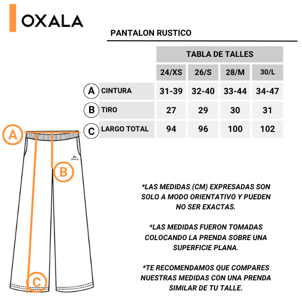 Pantalon rustico OXALA. Confeccionado en algodon rustico con lycra. Con elastico en cintura y dos bolsillos laterales. Cuenta con costuras reforzadas. Molderia wide